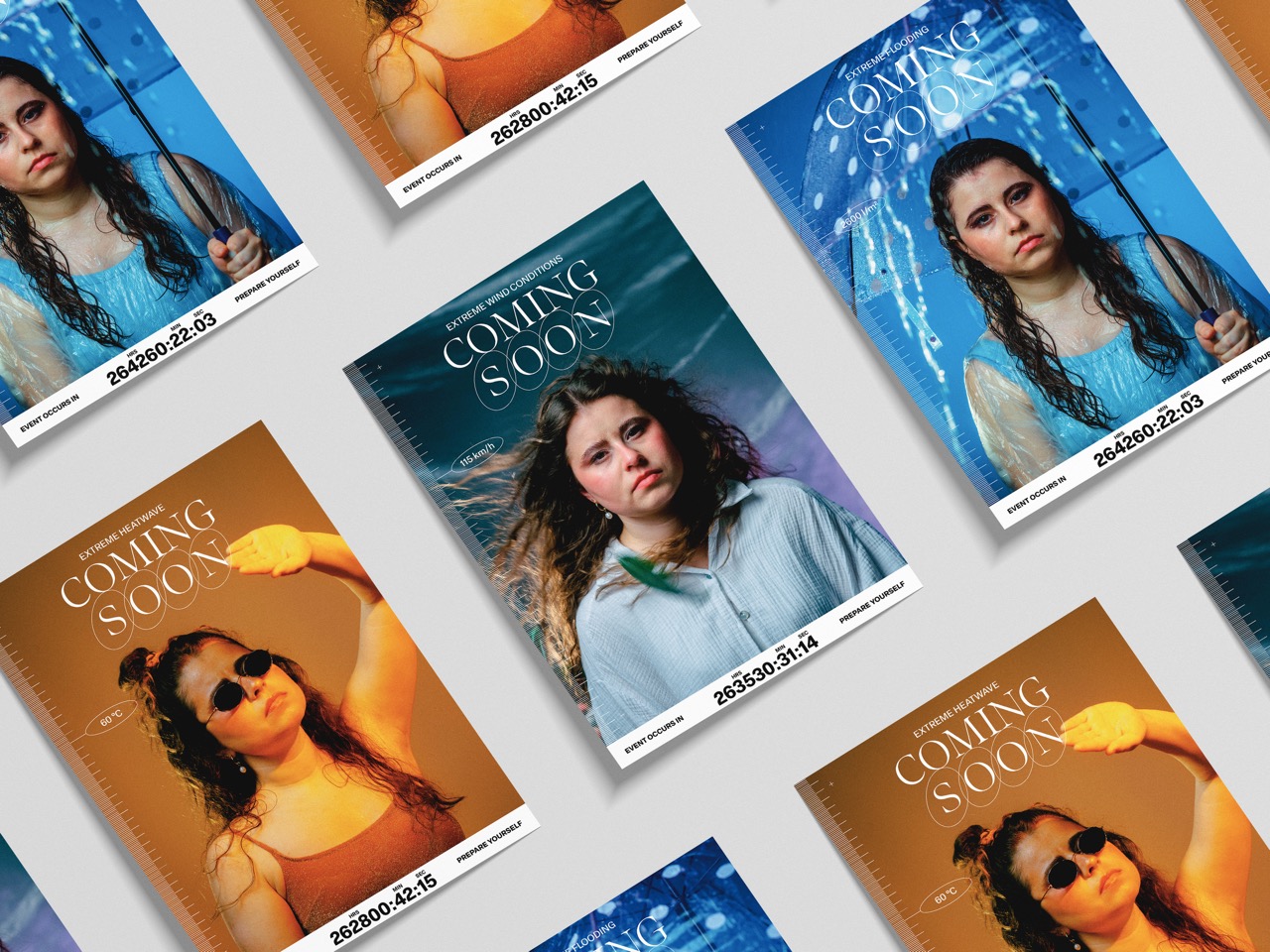 Die animierte Posterserie ‚Coming Soon‘ entstand im Rahmen einer Lehrveranstaltung und setzt sich mit den Auswirkungen des Klimawandels auseinander. Extremwettersituationen wurden inszeniert, um den Alltag zukünftiger Generationen sichtbar zu machen. Mein Beitrag umfasste die fotografische und filmische Umsetzung sowie konzeptionelle Mitentwicklung.